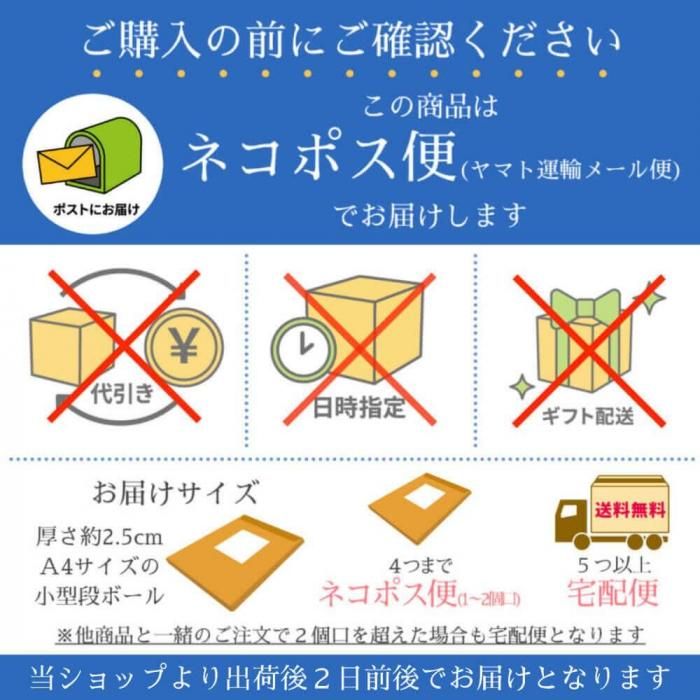 | 配送方法 | 【2つ以下】ネコポス便(郵便受け投函・1〜2個口) 【3つ以上】宅配便(佐川急便またはヤマト運輸) |